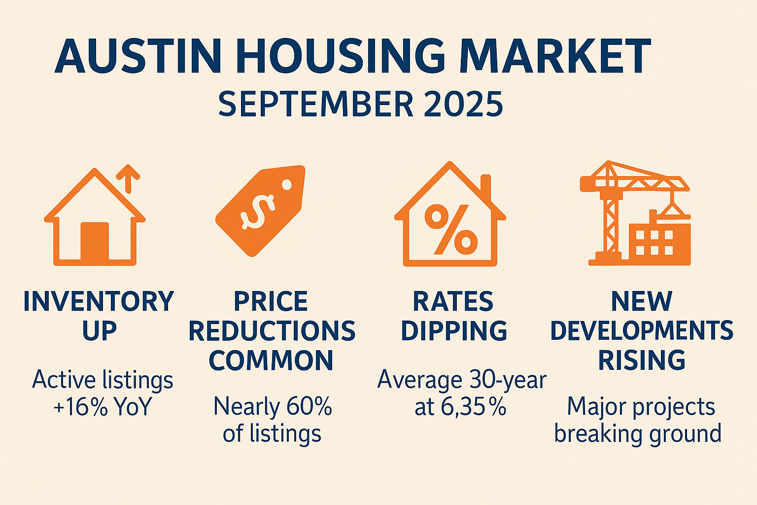 Nationally, the average 30-year fixed mortgage rate dipped to about 6.35%, the lowest level in nearly a year. For Austin buyers who’ve been on the sidelines, that small reduction can mean a meaningful difference in monthly payments. Affordability is still stretched, but the downward trend could encourage more contracts heading into the fall season.