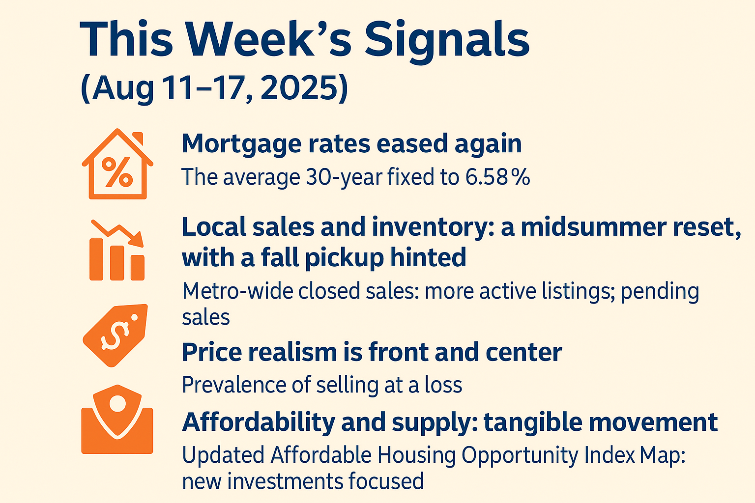 Mortgage rates eased again. The average 30-year fixed slipped to 6.58% this week, the lowest level since last October. Lower rates give buyers a little more purchasing power and may help spur activity as we head into late summer.