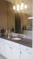 Prior to entering one of the homes on the tour, I was immediately surprised by what I saw: a wood-burning fireplace and sitting area…ON the front porch! Inside, the homes offer modern features such as the floor-to-ceiling drystack-tile fireplaces with art niches in the living room. The master bathroom features include white shaker-style cabinetry and decorative back-splash tile, under-mount sinks and more.