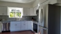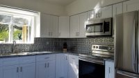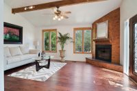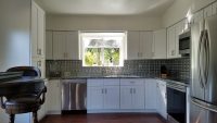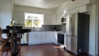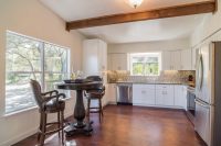 The kitchen was completely demolished and renovated, including White Shaker Cabinets with under-cabinet lighting and a pantry cabinet, Crosshatch backsplash, granite countertops and hardwood floors. Appliance package includes Stainless Steel refrigerator, microwave, range, dishwasher. Wonderful natural light from windows on two sides and the wood accent beam completes the space.
